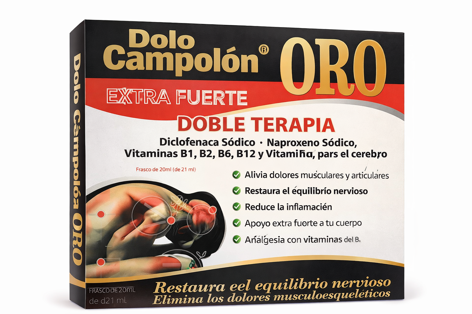Dolo Campolón Oro es una fórmula avanzada de doble terapia diseñada para combatir el dolor musculoesquelético y restaurar el equilibrio nervioso. Su combinación de diclofenaco sódico con vitaminas B1, B6, B12 y vitamina E ayuda a reducir la inflamación, aliviar el dolor y apoyar la regeneración del sistema nervioso.