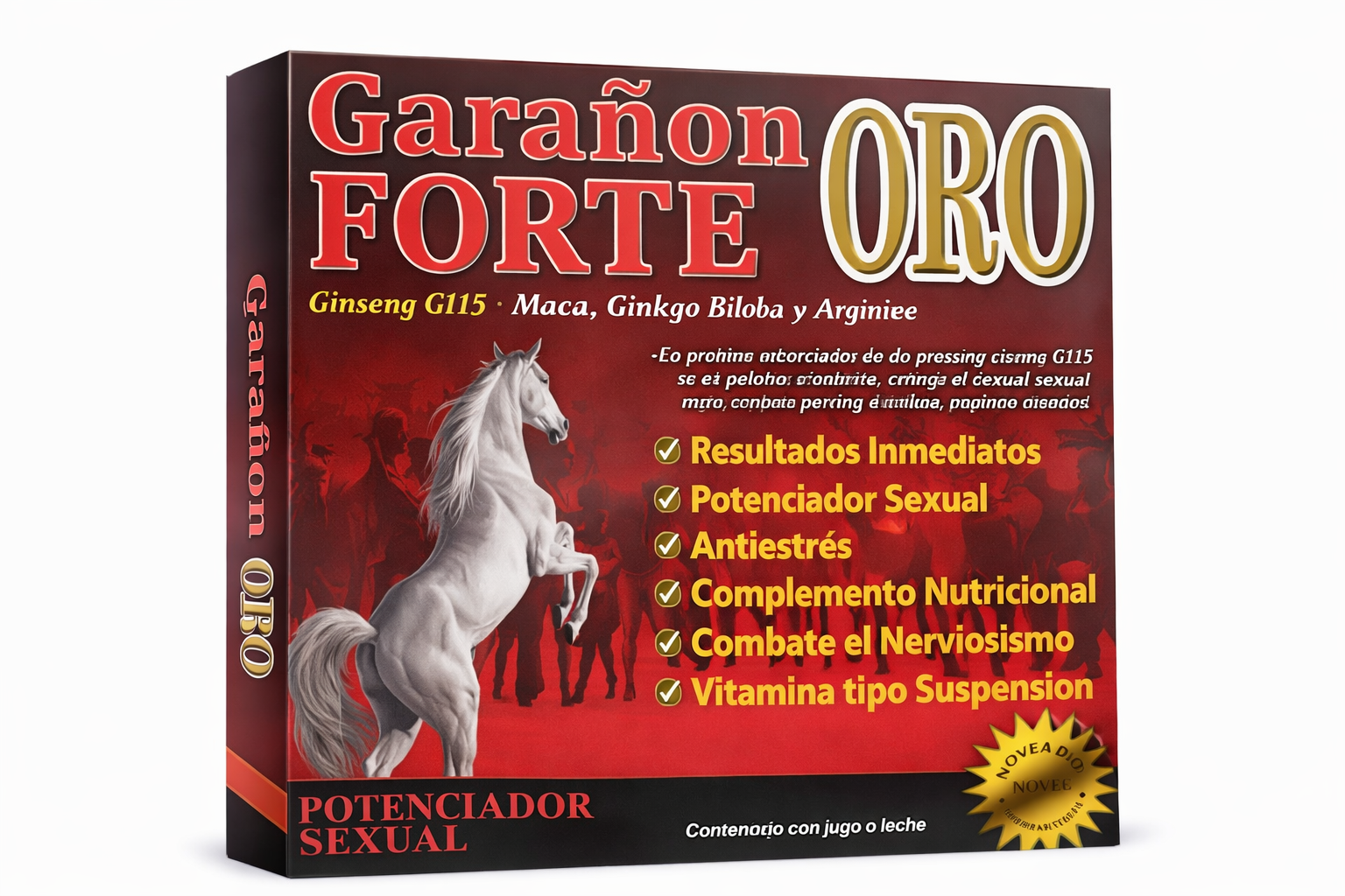 Garañón Forte Oro es un potente potenciador sexual masculino formulado con ingredientes naturales reconocidos por sus beneficios energizantes y estimulantes. Su fórmula ayuda a combatir el cansancio, aumentar la vitalidad, mejorar el desempeño físico y apoyar la potencia sexual masculina.
